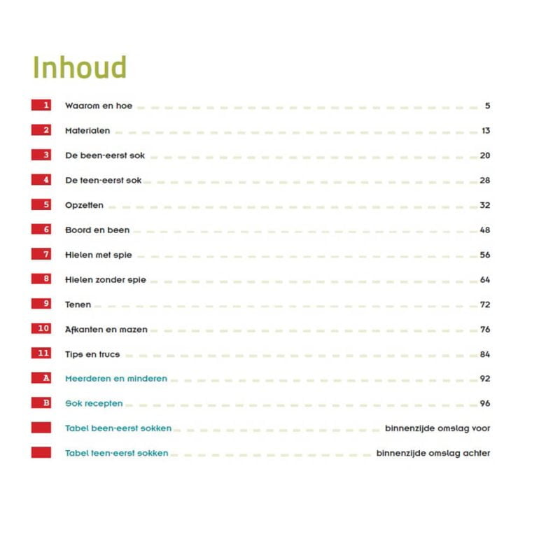 Na de hoofdstukken met materialen en de basissokken, vind je per sokonderdeel uitgebreide uitleg met foto’s. Ook vind je tabellen met de benodigde getallen voor het breien van een paar sokken in de maten 22 tot 47.